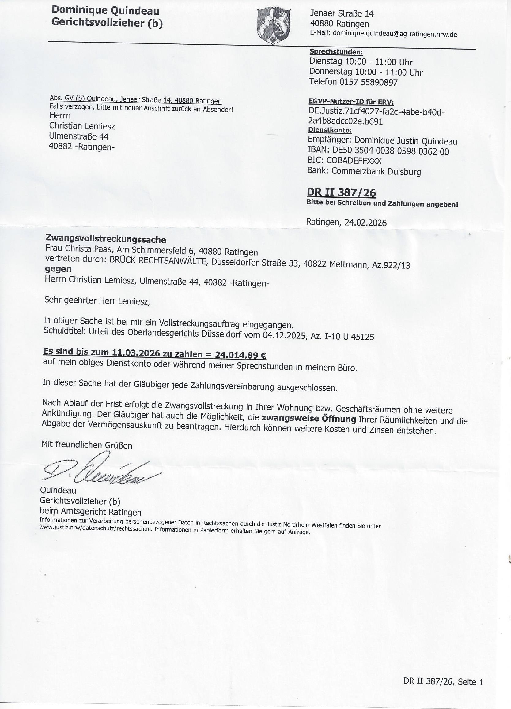 Jetzt werde ich durch ein Falsches Urteil am LG + OLG Düsseldorf auf Basis von mehrfacher Rechtsbeugung (nachweislich!) und Falschaussage (nachweislich!) gegen mich durch den Täter bzw. durch seine Frau zwangsgepfändet – mein Leben wird nun zum xten strategisch von Tätern zerstört – legal in der Bundesrepublik Deutschland, wenn der Täter „reich“ und „alteingesessen“ ist!: