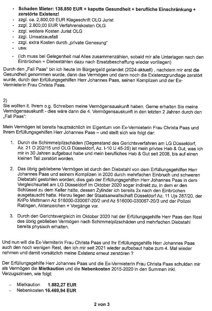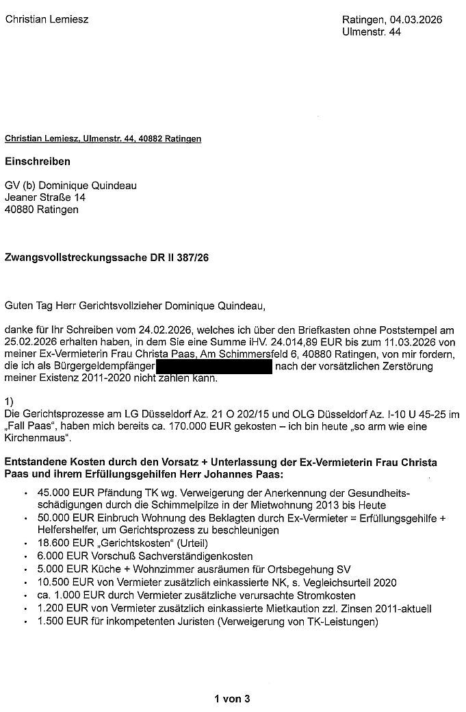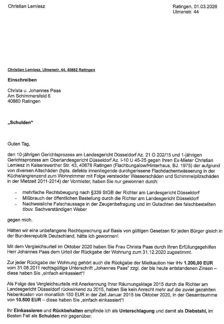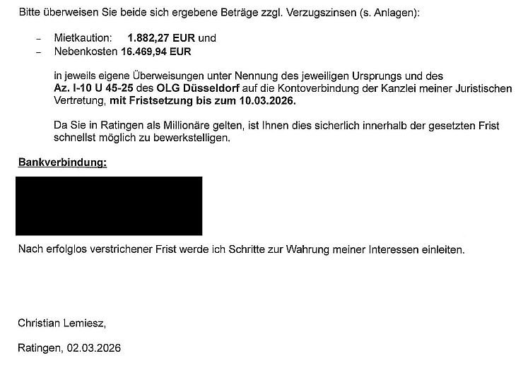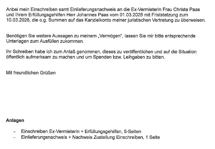 Mit Fristsetzung zum 10.03.2026 habe ich meinen Ex-Vermieter (lt. Mietvertrag + Kaution) und meine Ex-Vermieterin (seit Gerichtsverfahren…anstelle des „schriftlichen“ Vermieters“) in einem Einschreiben am 02.03.2026 aufgefordert mir die unrechtmäßig einbehaltene Mietkaution iHV 1.200 EUR und zuviel gezahlten Nebenkosten iHv 10.500 EUR auf das Kto. meines Juristen einzuzahlen. Da dies bis heute nicht erfolgt ist, veröffentliche ich hier den bereits angekündigten „Schritt“ zur Wahrung meiner Interessen.